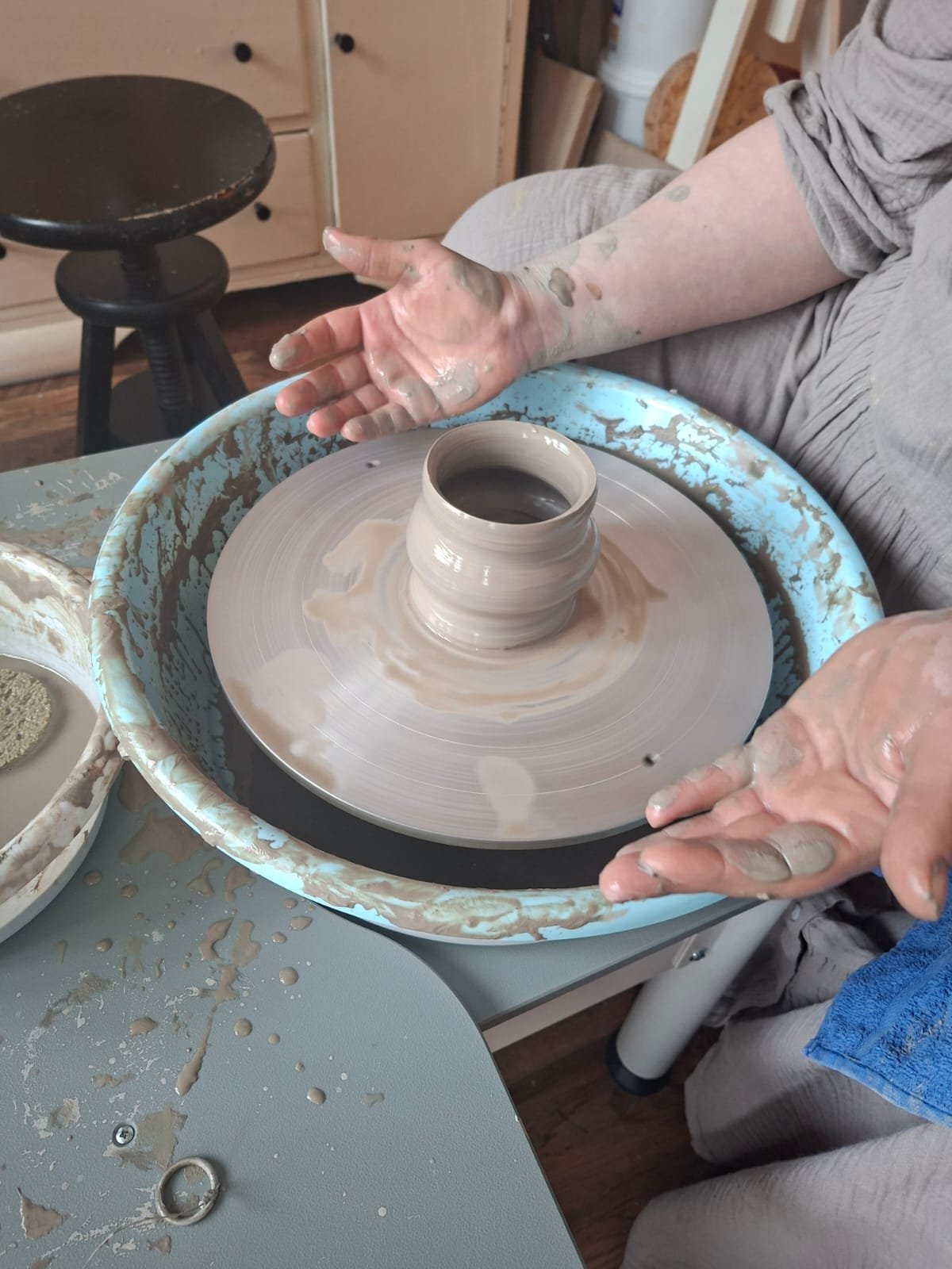 Im Töpferkurs an der Drehscheibe in Hasbergen bei Osnabrück lernst du Schritt für Schritt den Umgang mit Ton. Ohne Druck auf Perfektion stehen das Erleben des Materials, die eigene Intuition und die Freude am kreativen Prozess im Mittelpunkt. In entspannter Atmosphäre entstehen erste individuelle Gefäße.